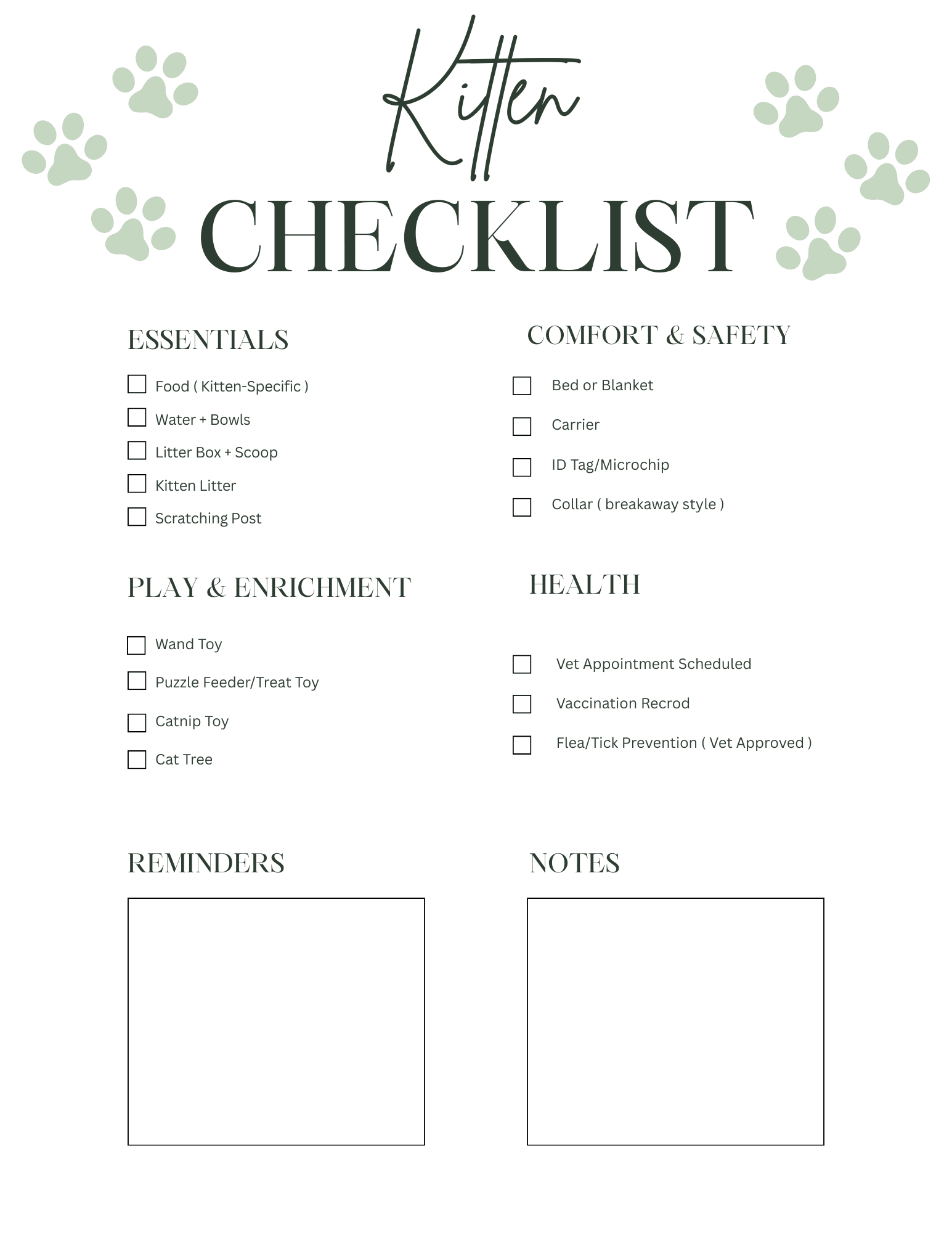 Everything you need for your kitten's first 30 days...food, litter, toys, & vet care. Stay organized & stress-free.